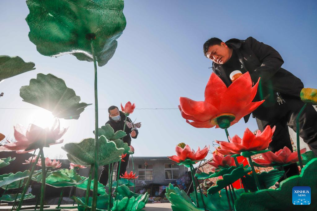 Workers install lotus-shaped lanterns in celebration of the upcoming Latern Festival in Dongjiuzhai Town of Zunhua, north China's Hebei Province, Jan. 31, 2023. The Lantern Festival, the 15th day of the first month of the Chinese lunar calendar, falls on Feb. 5 this year. The festival features family reunions, feasts, light shows and various cultural activities. (Photo by Liu Mancang/Xinhua)