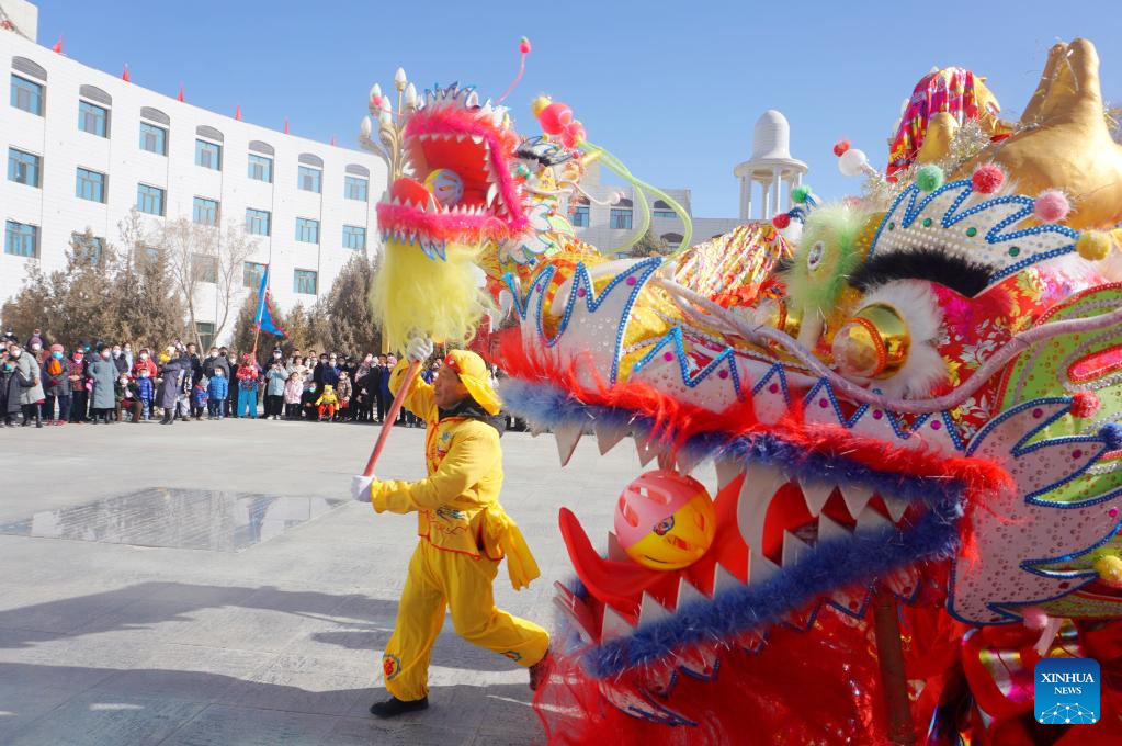 People perform a dragon dance in celebration of the upcoming Latern Festival in Kazak Autonomous County of Aksay in northwest China's Gansu Province, Jan. 30, 2023. The Lantern Festival, the 15th day of the first month of the Chinese lunar calendar, falls on Feb. 5 this year. The festival features family reunions, feasts, light shows and various cultural activities. (Photo by Ma Xiaowei/Xinhua)