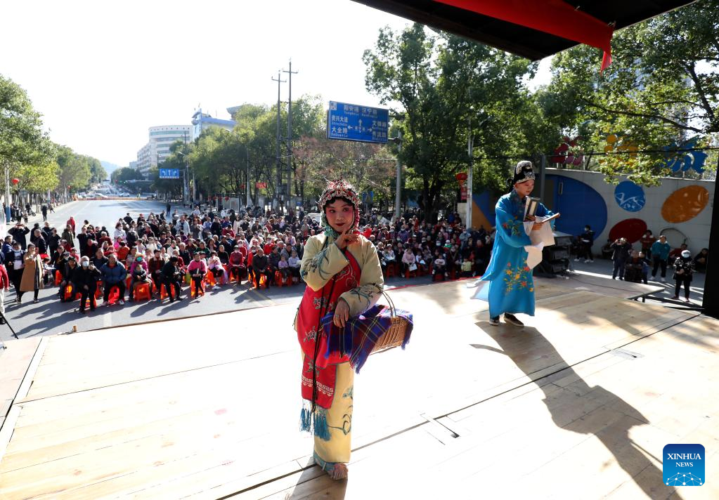 People enjoy a traditional Chinese opera in celebration of the upcoming Latern Festival in Zixing City, central China's Hunan Province, Jan. 30, 2023. The Lantern Festival, the 15th day of the first month of the Chinese lunar calendar, falls on Feb. 5 this year. The festival features family reunions, feasts, light shows and various cultural activities. (Photo by Li Ke/Xinhua)