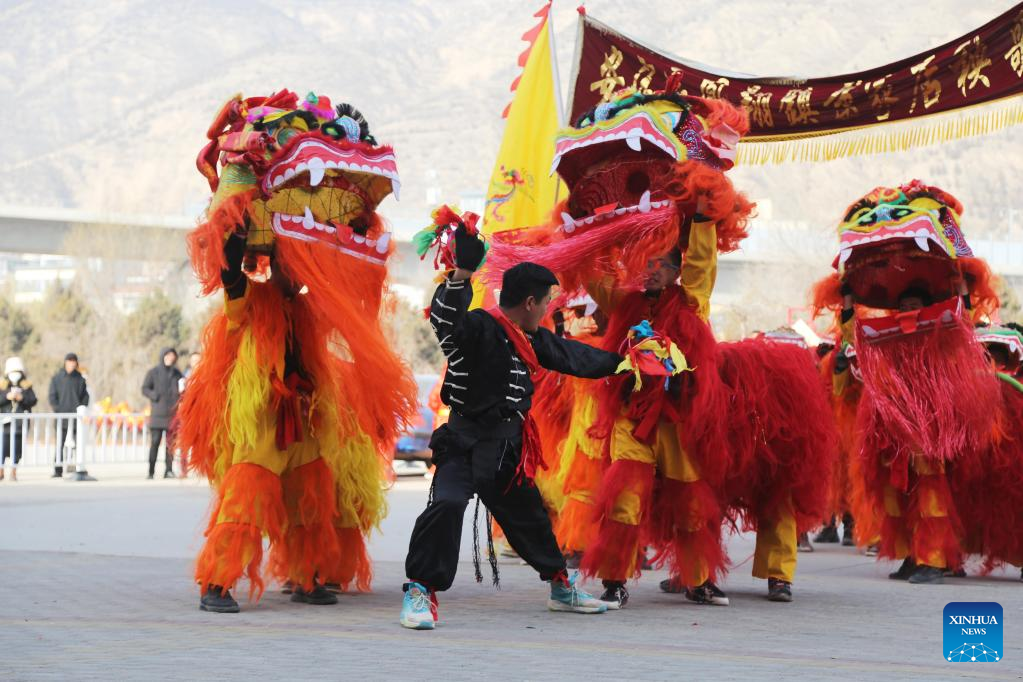 People perform lion dance in celebration of the upcoming Lantern Festival in Taiji Town of Yongjing County, northwest China's Gansu Province, Jan. 30, 2023. The Lantern Festival, the 15th day of the first month of the Chinese lunar calendar, falls on Feb. 5 this year. (Photo by Shi Youdong/Xinhua)