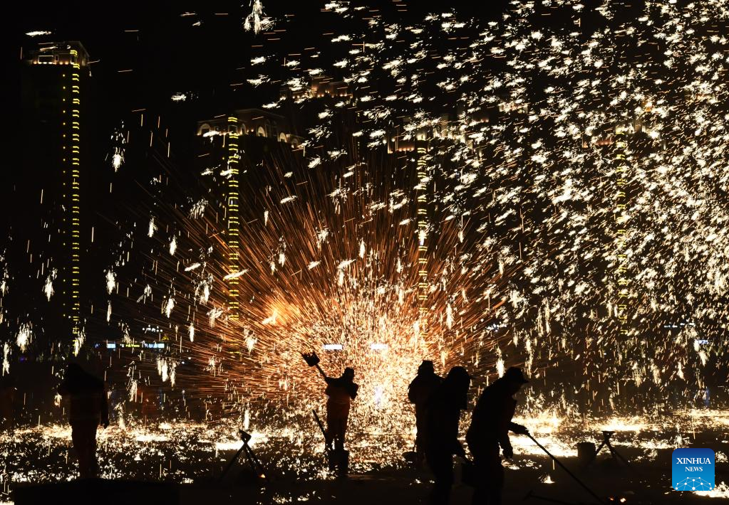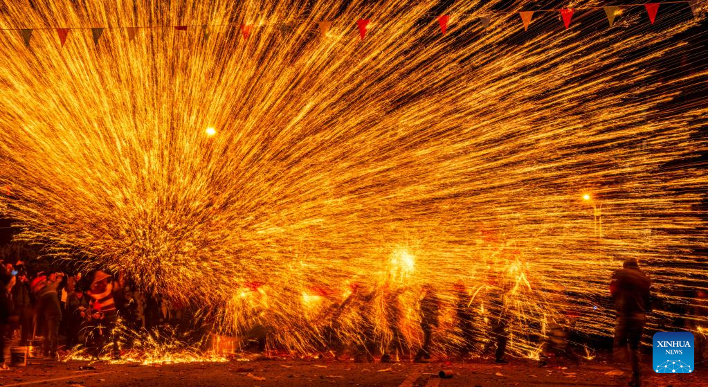 Folk artists play "iron flowers", a performance of splashing molten iron to create fireworks, in celebration of the upcoming Latern Festival at Goujiang Township of Bozhou District, Zunyi City of southwest China's Guizhou Province, Jan. 30, 2023. The Lantern Festival, the 15th day of the first month of the Chinese lunar calendar, falls on Feb. 5 this year. The festival features family reunions, feasts, light shows and various cultural activities. (Photo by Luo Xinghan/Xinhua)
