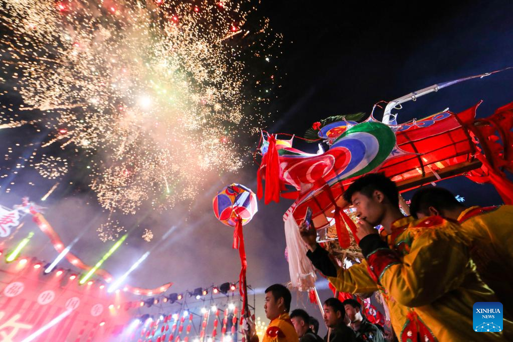 People perform a dragon dance in celebration of the upcoming Latern Festival at Liulong ancient township in Dafang County of Bijie, southwest China's Guizhou Province, Jan. 30, 2023. The Lantern Festival, the 15th day of the first month of the Chinese lunar calendar, falls on Feb. 5 this year. The festival features family reunions, feasts, light shows and various cultural activities. (Photo by Luo Dafu/Xinhua)