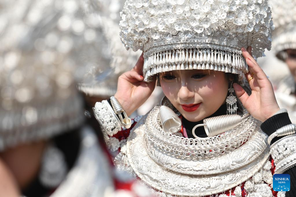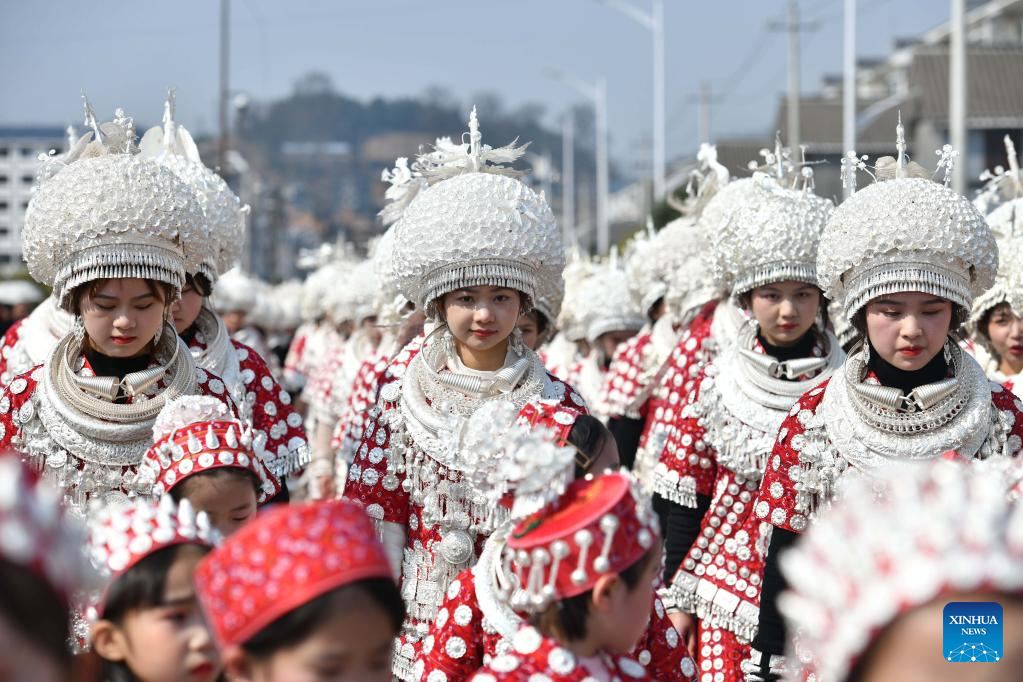 People of Miao ethnic group in traditional costumes participate in a parade to celebrate the upcoming Lantern Festival in Huangping County, southwest China's Guizhou Province, Jan. 31, 2023. The Lantern Festival, the 15th day of the first month of the Chinese lunar calendar, falls on Feb. 5 this year. (Photo by Liang Wen/Xinhua)