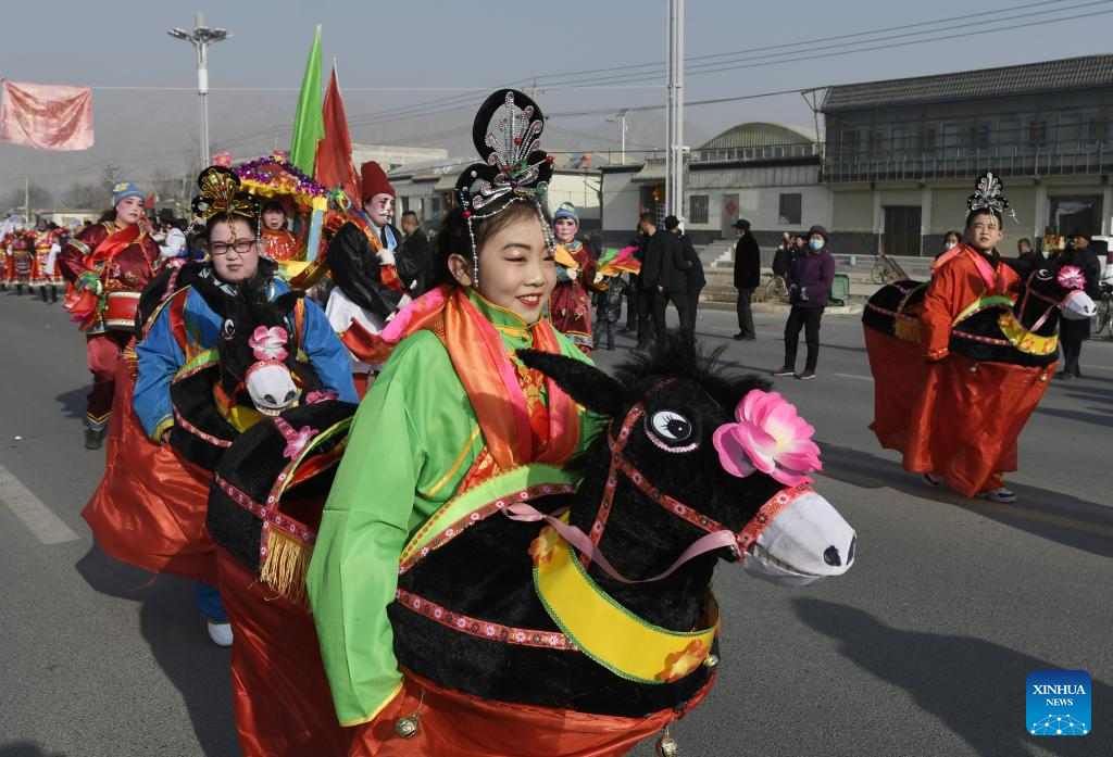 People perform the donkey dance in celebration of the upcoming Latern Festival at Taiji Township, Yongjing County of Linxia Hui Autonomous Prefecture, northwest China's Gansu Province, Jan. 30, 2023. The Lantern Festival, the 15th day of the first month of the Chinese lunar calendar, falls on Feb. 5 this year. The festival features family reunions, feasts, light shows and various cultural activities. (Photo by Shi Youdong/Xinhua)