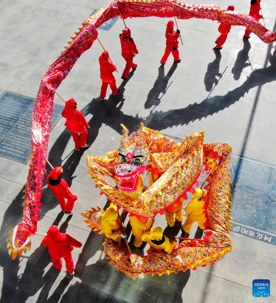 This aerial photo taken on Jan. 30, 2023 shows people performing dragon dance in celebration of the upcoming Lantern Festival in Kazak Autonomous County of Aksay in northwest China's Gansu Province. The Lantern Festival, the 15th day of the first month of the Chinese lunar calendar, falls on Feb. 5 this year. (Photo by Ma Xiaowei/Xinhua)