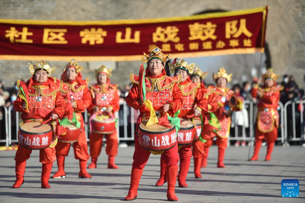 Actors in traditional Chinese costumes perform war drum in celebration of the upcoming Latern Festival at Zhengding ancient town in Shijiazhuang, north China's Hebei Province, Jan. 31, 2023. The Lantern Festival, the 15th day of the first month of the Chinese lunar calendar, falls on Feb. 5 this year. The festival features family reunions, feasts, light shows and various cultural activities. (Photo by Zhang Xiaofeng/Xinhua)