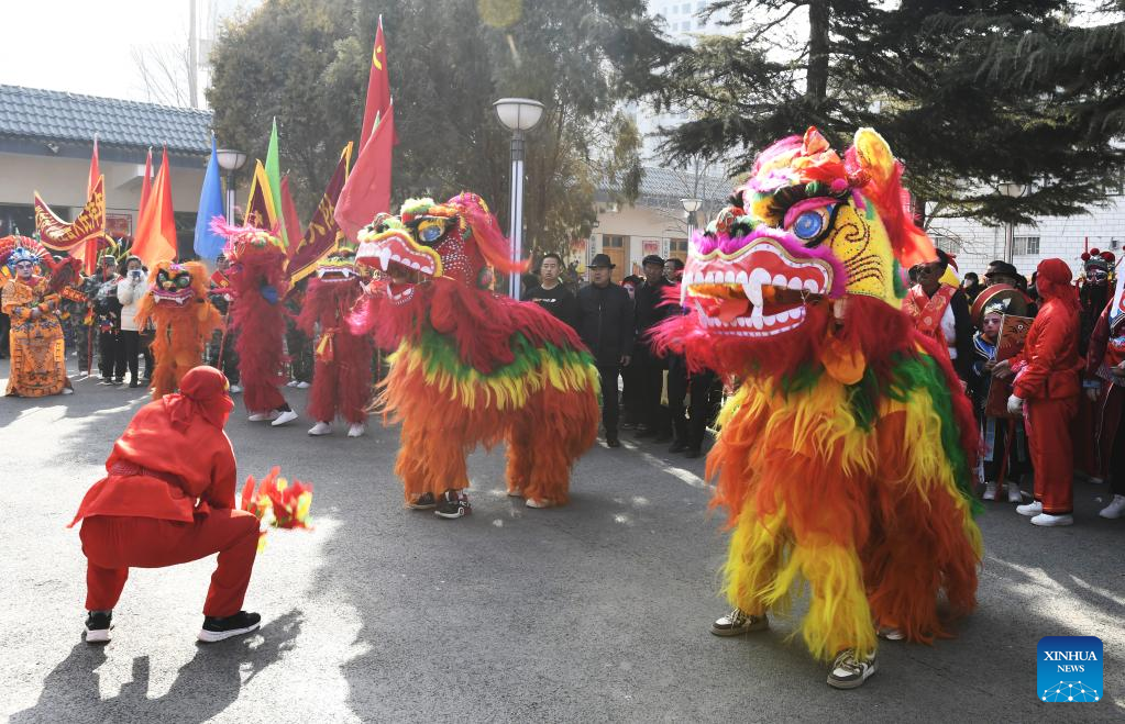 People perform a lion dance in celebration of the upcoming Latern Festival at Fengxiang Township, Anding District of Dingxi City in northwest China's Gansu Province, Jan. 31, 2023. The Lantern Festival, the 15th day of the first month of the Chinese lunar calendar, falls on Feb. 5 this year. The festival features family reunions, feasts, light shows and various cultural activities. (Photo by Wang Kexian/Xinhua)