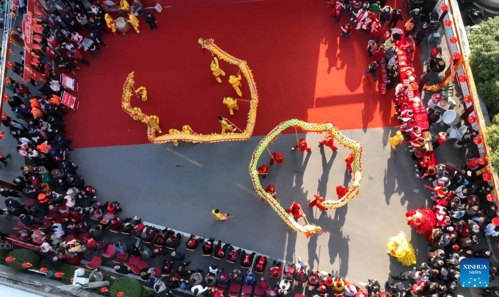 This aerial photo taken on Jan. 31, 2023 shows people performing dragon dance in celebration of the upcoming Lantern Festival in Zhuhui District of Hengyang City, central China's Hunan Province. The Lantern Festival, the 15th day of the first month of the Chinese lunar calendar, falls on Feb. 5 this year. (Photo by Cao Zhengping/Xinhua)
