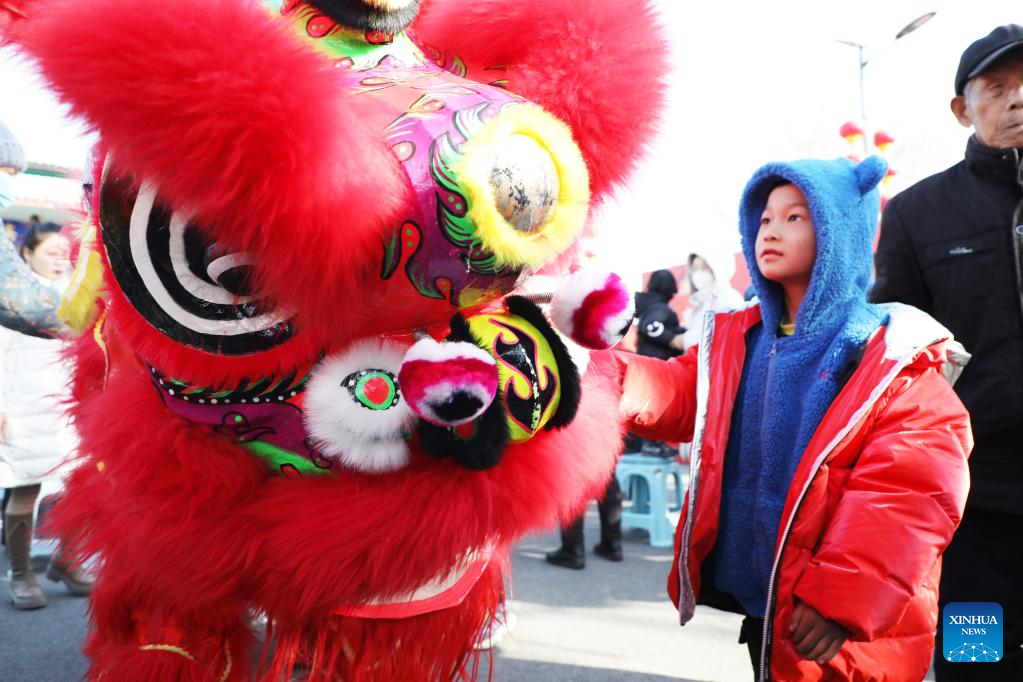 A boy enjoys a lion dance performance in celebration of the upcoming Latern Festival at Liushahe Township, Fengrun District of Tangshan, north China's Hebei Province, Jan. 30, 2023. The Lantern Festival, the 15th day of the first month of the Chinese lunar calendar, falls on Feb. 5 this year. The festival features family reunions, feasts, light shows and various cultural activities. (Photo by Zhu Dayong/Xinhua)