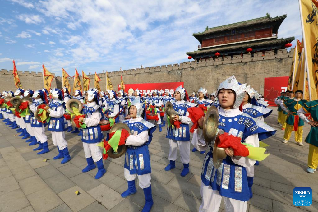Students in traditional Chinese costumes perform war drum in celebration of the upcoming Latern Festival at Zhengding ancient town in Shijiazhuang, north China's Hebei Province, Jan. 31, 2023. The Lantern Festival, the 15th day of the first month of the Chinese lunar calendar, falls on Feb. 5 this year. The festival features family reunions, feasts, light shows and various cultural activities. (Photo by Liang Zidong/Xinhua)