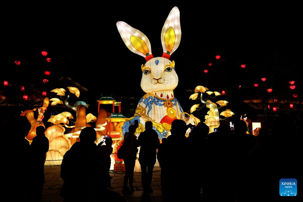 People watch a gigantic rabbit-shaped lantern in celebration of the upcoming Latern Festival at Taierzhuang ancient city of Zaozhuang, east China's Shandong Province, Jan. 30, 2023. The Lantern Festival, the 15th day of the first month of the Chinese lunar calendar, falls on Feb. 5 this year. The festival features family reunions, feasts, light shows and various cultural activities. (Photo by Sun Zhongzhe/Xinhua)