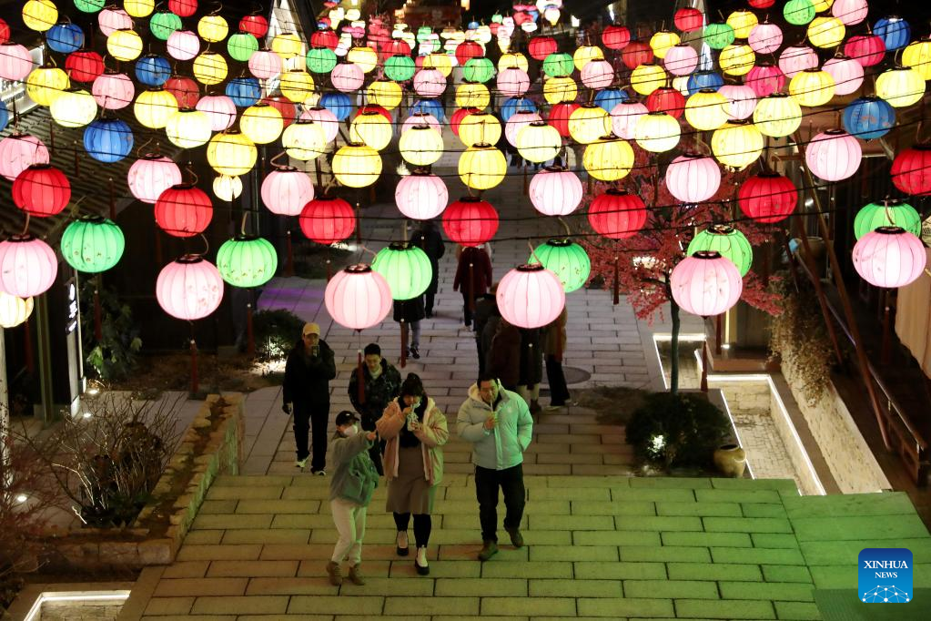 People enjoy light installations in celebration of the upcoming Latern Festival at a scenic spot in the western coast economic zone in Qingdao, east China's Shandong Province, Jan. 30, 2023. The Lantern Festival, the 15th day of the first month of the Chinese lunar calendar, falls on Feb. 5 this year. The festival features family reunions, feasts, light shows and various cultural activities. (Photo by Wang Peike/Xinhua)