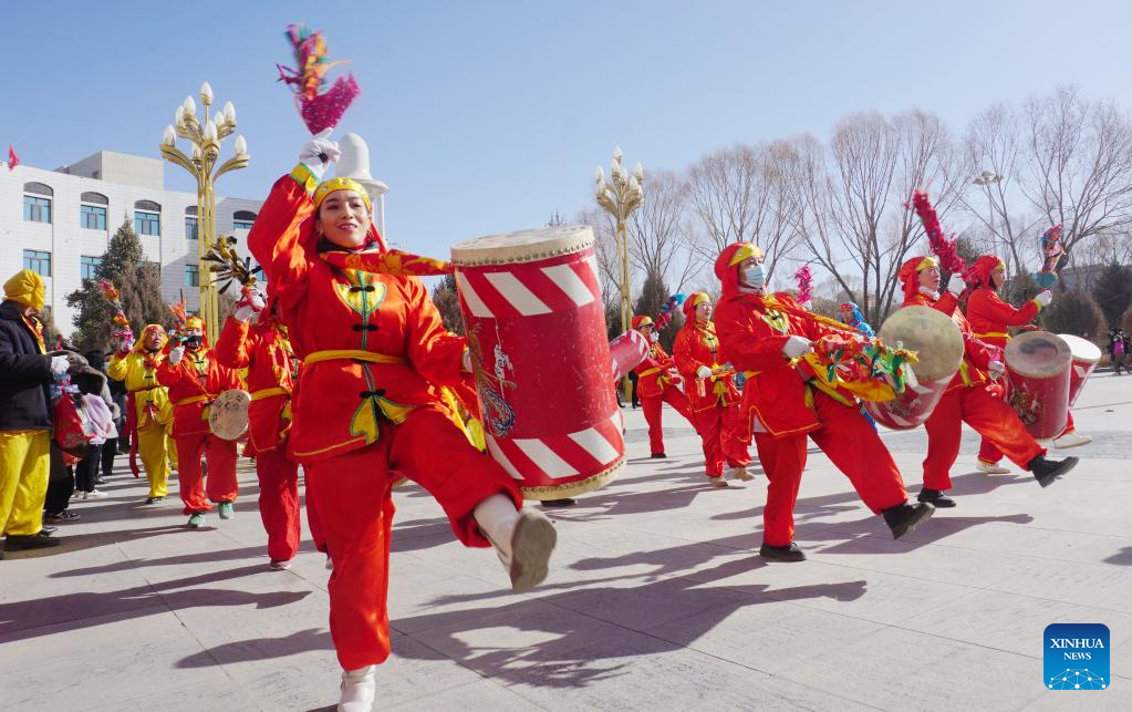 People perform the Taiping Drum dance in celebration of the upcoming Latern Festival in Kazak Autonomous County of Aksay in northwest China's Gansu Province, Jan. 30, 2023. The Lantern Festival, the 15th day of the first month of the Chinese lunar calendar, falls on Feb. 5 this year. The festival features family reunions, feasts, light shows and various cultural activities. (Photo by Ma Xiaowei/Xinhua)