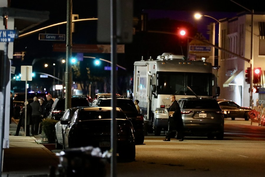 Police officers work on the scene of a mass shooting in Monterey Park, California, the United States, Jan. 22, 2023. (Xinhua)