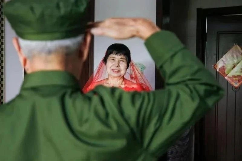 For 55 years, the couple had dreamed of having their wedding photos taken. Their dream came true. In one photo, Li, clad in a red wedding dress, smiles broadly while Ren holds her with his left hand and salutes with his right hand.