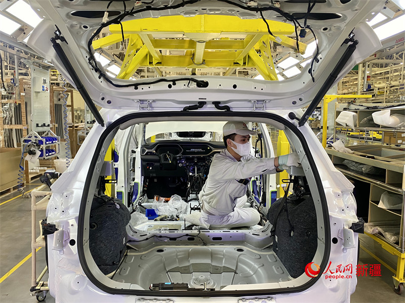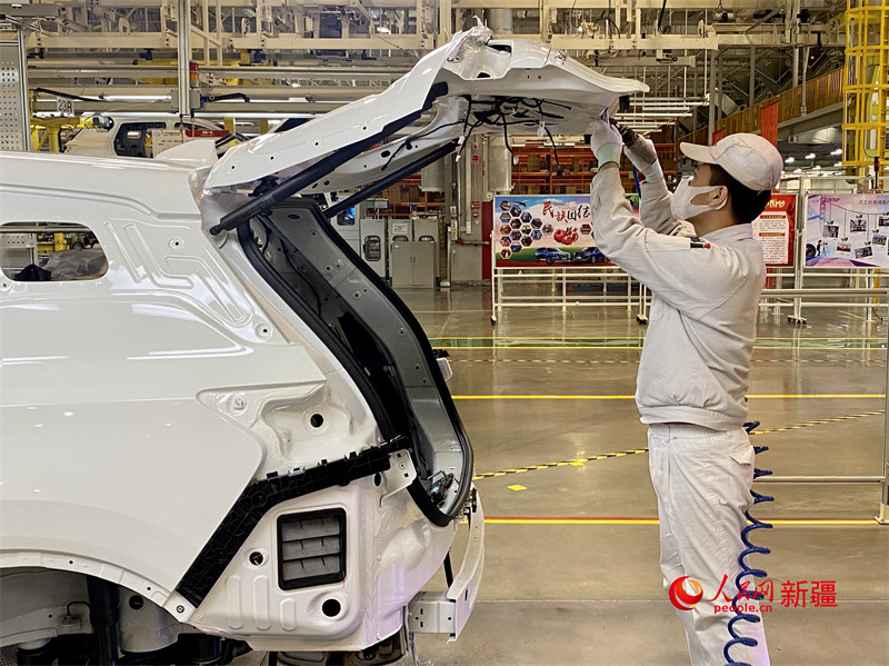 A worker assembles an automobile at a plant of the Xinjiang branch of Guangzhou Automobile Group Motor Co., Ltd. located in the Urumqi Economic and Technological Development Zone, Urumqi, capital city of northwest China's Xinjiang Uygur Autonomous Region. (People's Daily Online/Li Long)