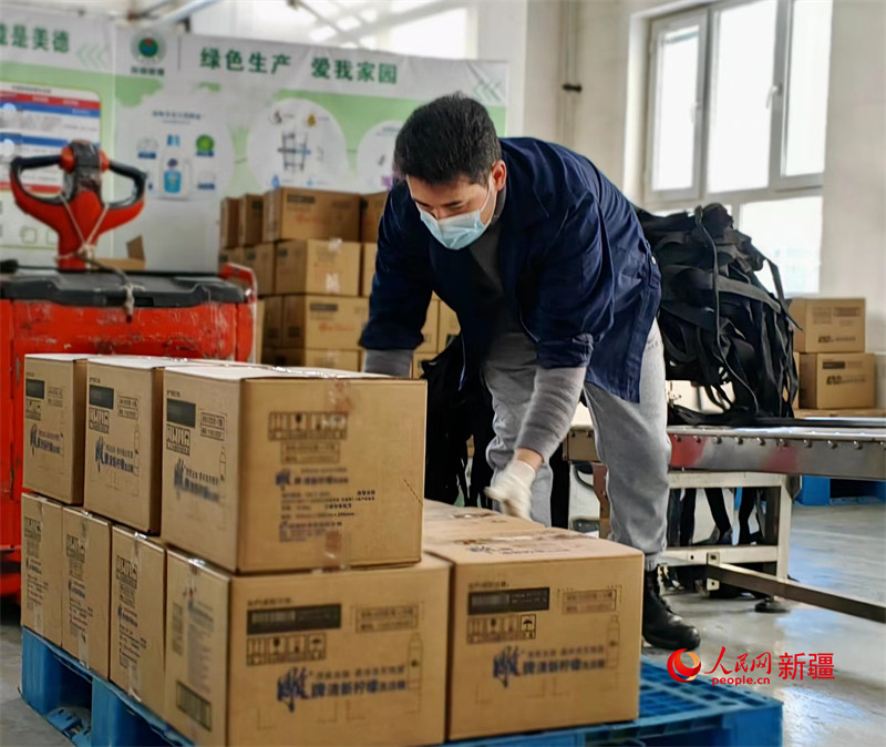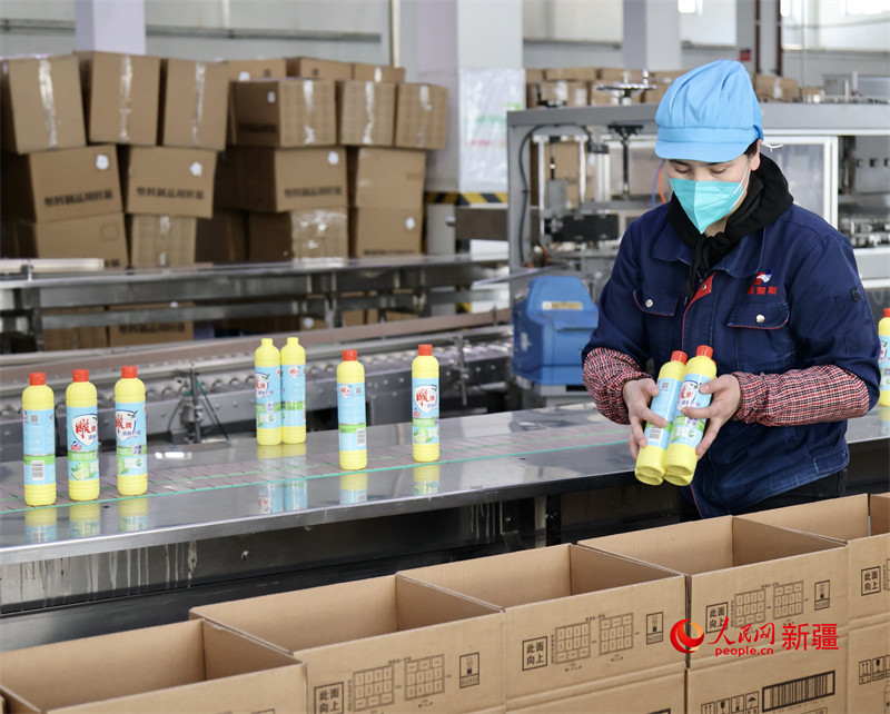 A worker packs products at a factory of Nice Urumqi Co., Ltd. under Nice Group, a Chinese manufacturer of household cleaning products, in the Urumqi Economic and Technological Development Zone, Urumqi, capital city of northwest China's Xinjiang Uygur Autonomous Region. (People's Daily Online/Li Long)
