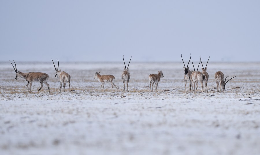 This photo taken on April 20, 2021 shows Tibetan antelopes in the Sanjiangyuan area in northwest China's Qinghai Province. (Xinhua/Wu Gang)