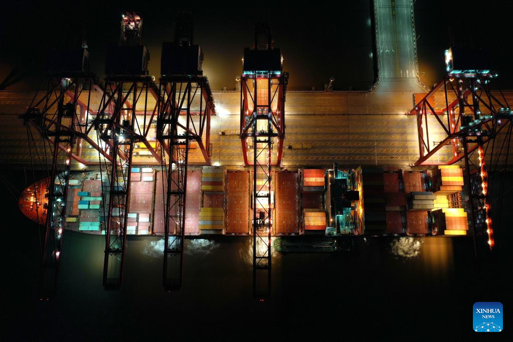 This aerial photo taken on Jan. 31, 2023 shows a cargo ship docking at a container terminal of Ningbo Zhoushan Port in east China's Zhejiang Province. (Xinhua/Huang Zongzhi)