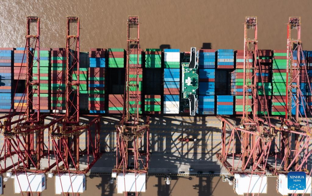 This aerial photo taken on Jan. 31, 2023 shows a cargo ship unloading containers at Dapukou Container Terminal of Ningbo Zhoushan Port in east China's Zhejiang Province. (Xinhua/Xu Yu)