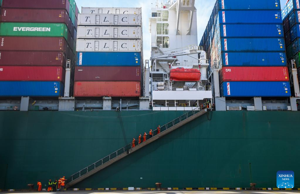 Staff members board a container ship at Dapukou Container Terminal of Ningbo Zhoushan Port in east China's Zhejiang Province, Jan. 31, 2023. (Xinhua/Xu Yu)