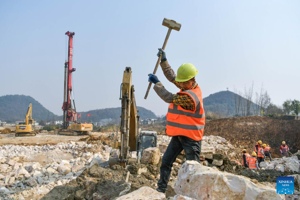 A man works at the construction site of a Midea Group's project in Gui'an New Area, southwest China's Guizhou Province, Feb. 1, 2023. The construction of 687 major projects, with a total investment of more than 376.7 billion yuan (about 55.9 billion U.S. dollars), commenced in Guizhou Province on Wednesday. (Xinhua/Yang Wenbin)