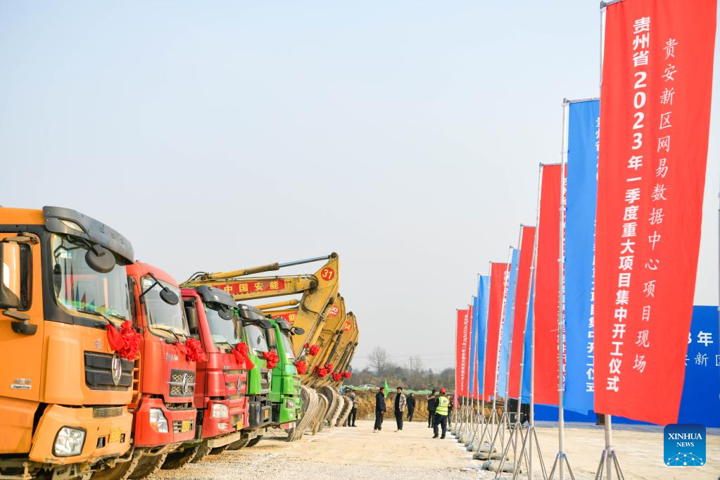This photo taken on Feb. 1, 2023 shows the commencement ceremony of 687 major projects of Guizhou in the first quarter of 2023 held in a data center construction site in Gui'an New Area, southwest China's Guizhou Province. The construction of 687 major projects, with a total investment of more than 376.7 billion yuan (about 55.9 billion U.S. dollars), commenced in Guizhou Province on Wednesday. (Xinhua/Yang Wenbin)