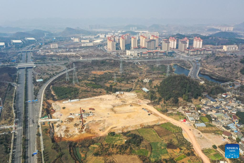 This aerial photo taken on Feb. 1, 2023 shows the construction site of an aerospace industry incubator project in Gui'an New Area, southwest China's Guizhou Province. The construction of 687 major projects, with a total investment of more than 376.7 billion yuan (about 55.9 billion U.S. dollars), commenced in Guizhou Province on Wednesday. (Xinhua/Yang Wenbin)