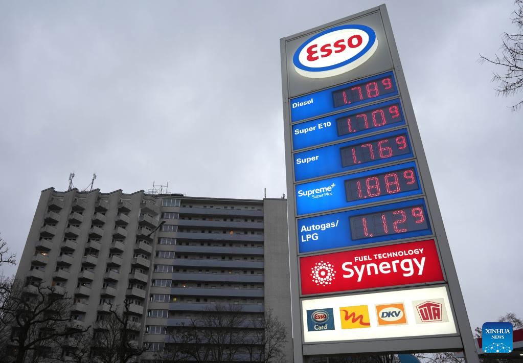 A price board is seen at a gas station in Berlin, Germany, on Feb. 1, 2023. Annual inflation in the eurozone is projected to fall to 8.5 percent in January from 9.2 percent in December 2022, according to a flash estimate published on Wednesday by Eurostat, the European Union's (EU) statistical bureau. (Photo by Stefan Zeitz/Xinhua)