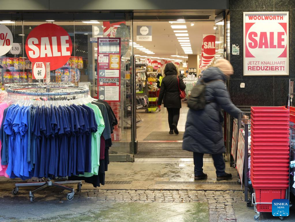 People shop at a store with discount signs in Berlin, Germany, on Feb. 1, 2023. Annual inflation in the eurozone is projected to fall to 8.5 percent in January from 9.2 percent in December 2022, according to a flash estimate published on Wednesday by Eurostat, the European Union's (EU) statistical bureau. (Photo by Stefan Zeitz/Xinhua)