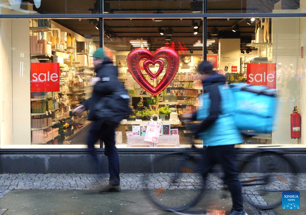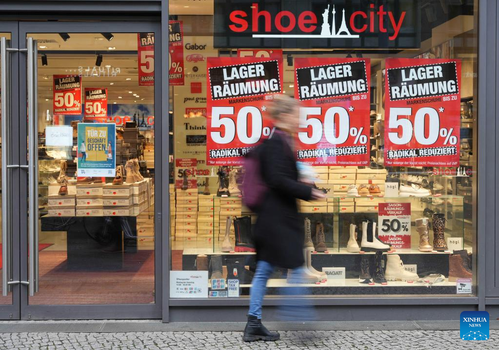 People walk past a store in Berlin, Germany, on Feb. 1, 2023. Annual inflation in the eurozone is projected to fall to 8.5 percent in January from 9.2 percent in December 2022, according to a flash estimate published on Wednesday by Eurostat, the European Union's (EU) statistical bureau. (Photo by Stefan Zeitz/Xinhua)