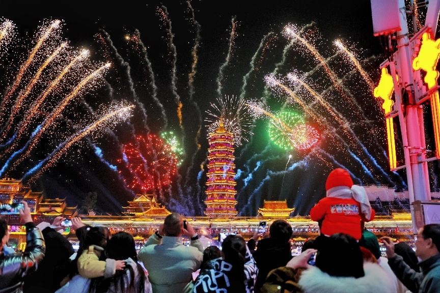 A firework show is performed in Huzhou, east China's Zhejiang province, Jan. 27, 2023. (People's Daily Online/Zhou Wei)