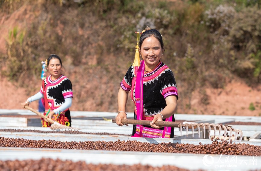 Photo shows coffee farmers drying coffee beans in Menglian Dai, Lahu and Wa autonomous county, Pu’er, southwest China’s Yunnan Province. (People’s Daily Online/Hu Zunhui)