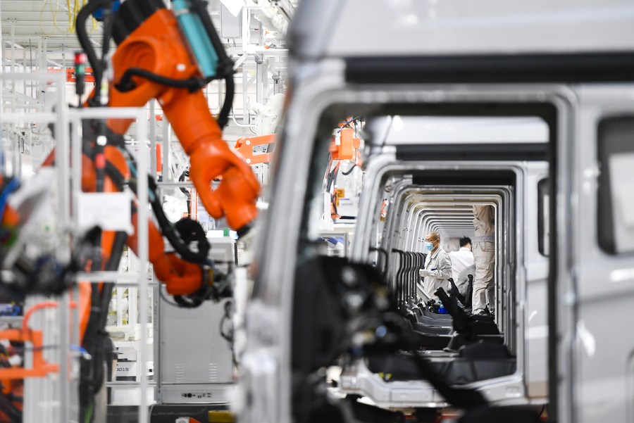 People work at an intelligent plant for manufacturing the FAW Jiefang J7 trucks in Changchun, northeast China's Jilin Province, Jan. 31, 2023. (Xinhua/Xu Chang)