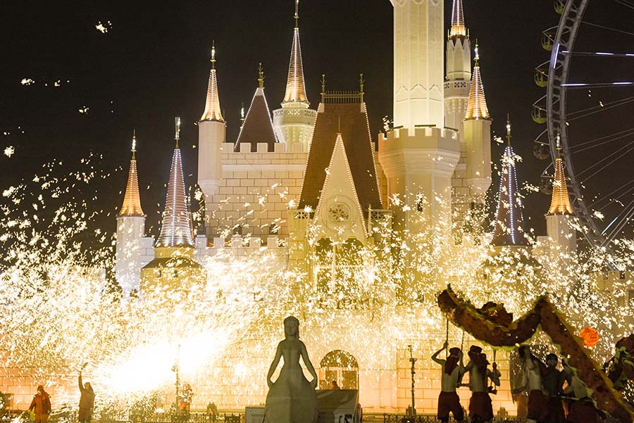 Photo taken on Jan. 31, 2023, shows an "iron flower" performance, in which molten iron is splashed around to create fireworks, at a temple fair held at Shijingshan Amusement Park in Beijing. (People’s Daily Online/Peng Yukai)