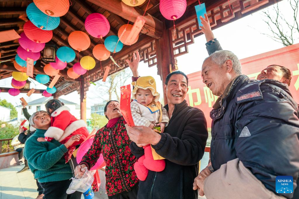 Villagers solve lantern riddles at Yangfeng Village in Changxing County, east China's Zhejiang Province, Feb. 2, 2023. (Photo by Wu Zheng/Xinhua)