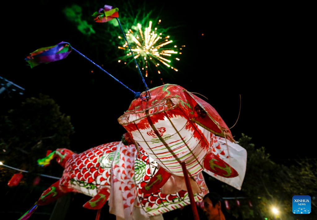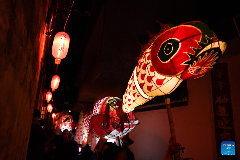 People holding fish-shaped lanterns parade during the new year celebrations in Shexian County of Huangshan City, east China's Anhui Province, Jan. 31, 2023. (Xinhua/Du Yu)