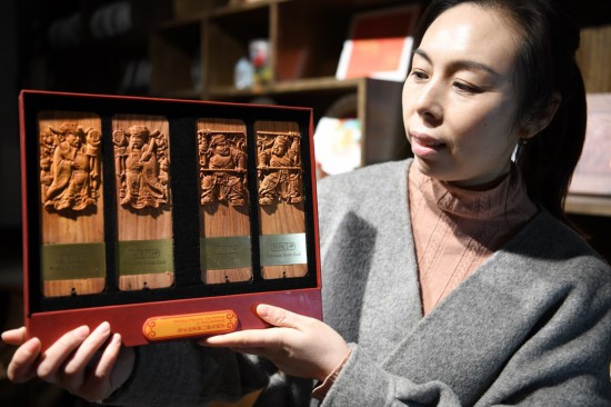 A staff member displays a cultural and creative product of woodblock New Year painting at the Wuqiang woodblock New Year painting museum in Wuqiang County, north China's Hebei Province, Feb. 3, 2023. (Xinhua/Mu Yu)
