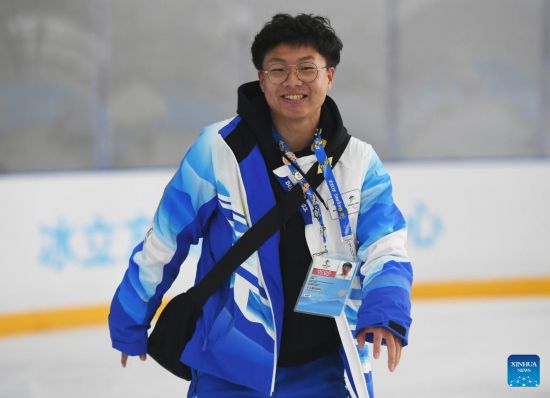 Liu Xu, venue operation team member of Beijing 2022 Winter Olympics, experience winter sports activities at National Aquatics Centre (the "Ice Cube") in Beijing, capital of China, Feb. 4, 2023. Activities were held here on Saturday to mark the one-year anniversary of Beijing 2022 Winter Olympics. (Xinhua/Ren Chao)