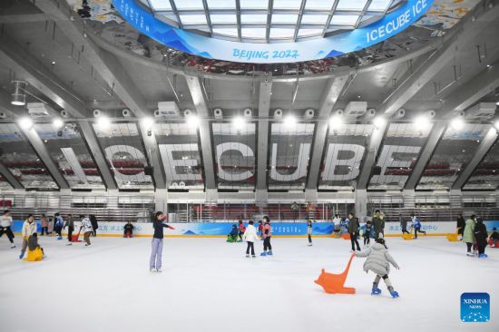 People enjoy skating at National Aquatics Centre (the "Ice Cube") in Beijing, capital of China, Feb. 4, 2023. Activities were held here on Saturday to mark the one-year anniversary of Beijing 2022 Winter Olympics. (Xinhua/Ren Chao)