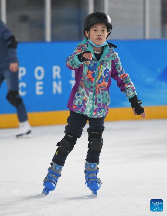 A child enjoys skating at National Aquatics Centre (the "Ice Cube") in Beijing, capital of China, Feb. 4, 2023. Activities were held here on Saturday to mark the one-year anniversary of Beijing 2022 Winter Olympics. (Xinhua/Ren Chao)