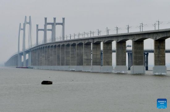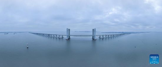 This photo taken on Feb. 4, 2023 shows the Quanzhou Bay cross-sea bridge, a part of the Fuzhou-Xiamen high-speed railway, in southeast China's Fujian Province.