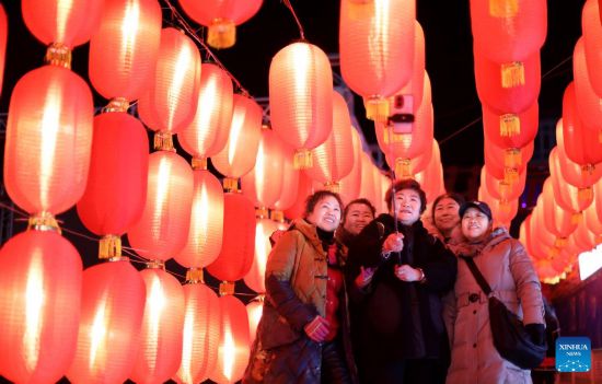 Tourists pose for photos at Liaohe ancient street in Yingkou, northeast China's Liaoning Province, Feb. 3, 2023. The Liaohe ancient street has been decorated with various lanterns to greet the Lantern Festival, the 15th day of the first month of the Chinese lunar calendar, which falls on Feb. 5 this year. (Xinhua/Yao Jianfeng)