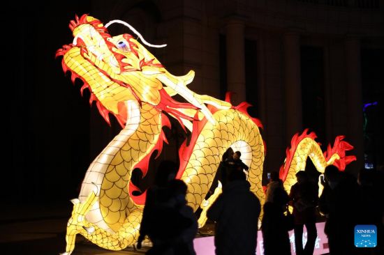 Tourists view a lantern at Liaohe ancient street in Yingkou, northeast China's Liaoning Province, Feb. 3, 2023. The Liaohe ancient street has been decorated with various lanterns to greet the Lantern Festival, the 15th day of the first month of the Chinese lunar calendar, which falls on Feb. 5 this year. (Xinhua/Yao Jianfeng)