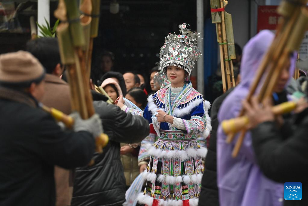 People of Miao ethnic group take part in the "Bainiaoyi" Lusheng festival in Dangjiu Village, Gandong Township, Rongshui Miao Autonomous County, south China's Guangxi Zhuang Autonomous Region, Feb. 2, 2023. "Bainiaoyi" Lusheng festival is a traditional festival in Gandong Township, which is held on the 12th day of the first month on Chinese lunar calendar, during which people wear "bainiaoyi," a traditional clothing of ethnic group, blow Lusheng, a traditional reed-pipe wind instrument, and perform traditional dancing. (Xinhua/Huang Xiaobang)