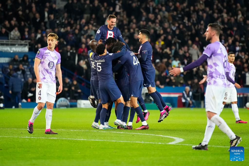 Players of Paris Saint-Germain celebrate scoring during a French Ligue 1 football match between Paris Saint-Germain (PSG) and Toulouse FC in Paris, France, Feb. 4, 2023. (Photo by Glenn Gervot/Xinhua)