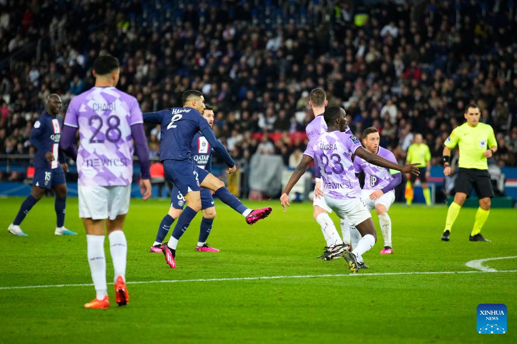 Paris Saint-Germain's Achraf Hakimi (3rd L) shoots the ball for the first goal during a French Ligue 1 football match between Paris Saint-Germain (PSG) and Toulouse FC in Paris, France, Feb. 4, 2023. (Photo by Glenn Gervot/Xinhua)