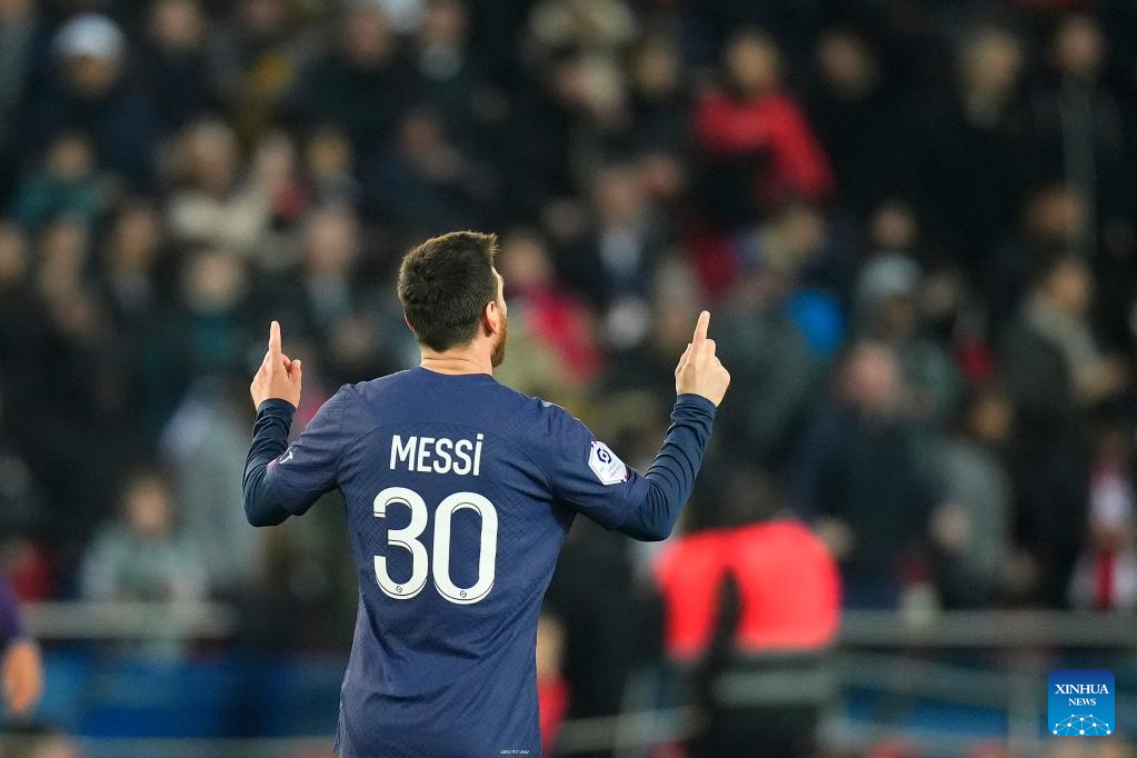 Paris Saint-Germain's Lionel Messi celebrates his goal during a French Ligue 1 football match between Paris Saint-Germain (PSG) and Toulouse FC in Paris, France, Feb. 4, 2023. (Photo by Glenn Gervot/Xinhua)