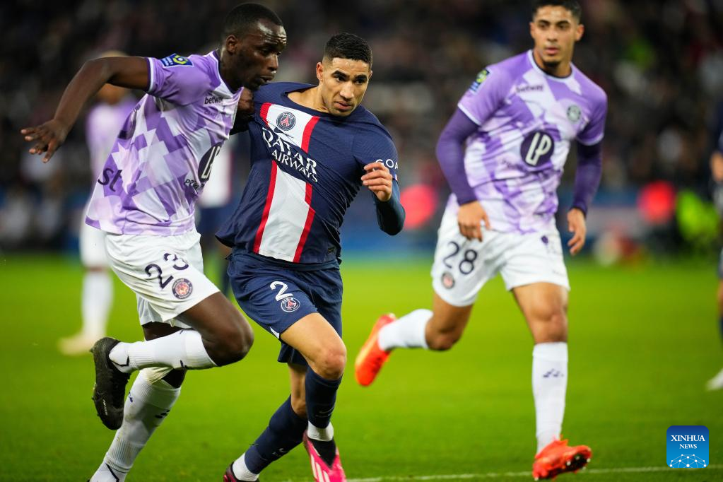 Paris Saint-Germain's Achraf Hakimi (C) vies with Toulouse FC's Moussa Diarra (L) during a French Ligue 1 football match between Paris Saint-Germain (PSG) and Toulouse FC in Paris, France, Feb. 4, 2023. (Photo by Glenn Gervot/Xinhua)