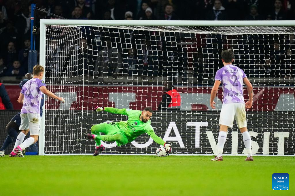 Paris Saint-Germain's Gianluigi Donnarumma makes a save during a French Ligue 1 football match between Paris Saint-Germain (PSG) and Toulouse FC in Paris, France, Feb. 4, 2023. (Photo by Glenn Gervot/Xinhua)